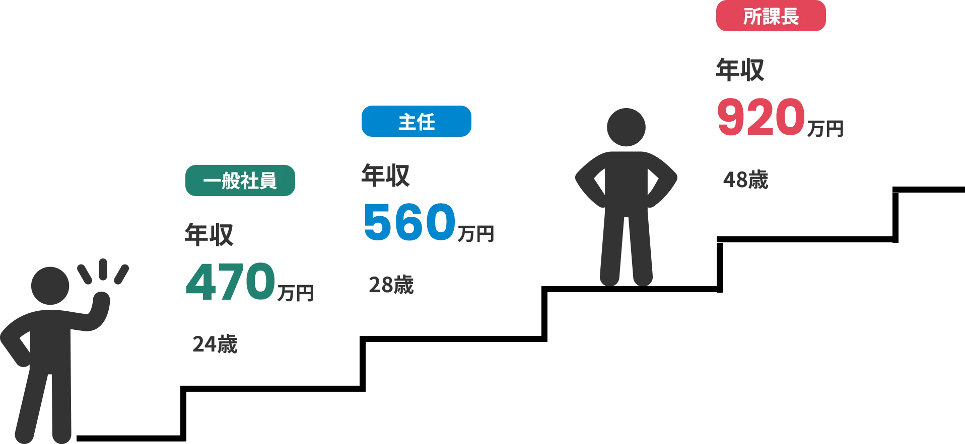 役割や責任が広がるにつれて、任される仕事の範囲や期待も変わり、それに応じて年収も少しずつ変化していきます。ここではGlobal Staff(総合職)の一例として、一般社員から主任、所課長へと役割が移り変わる節目ごとに、成長の目安となる年収イメージを紹介します。